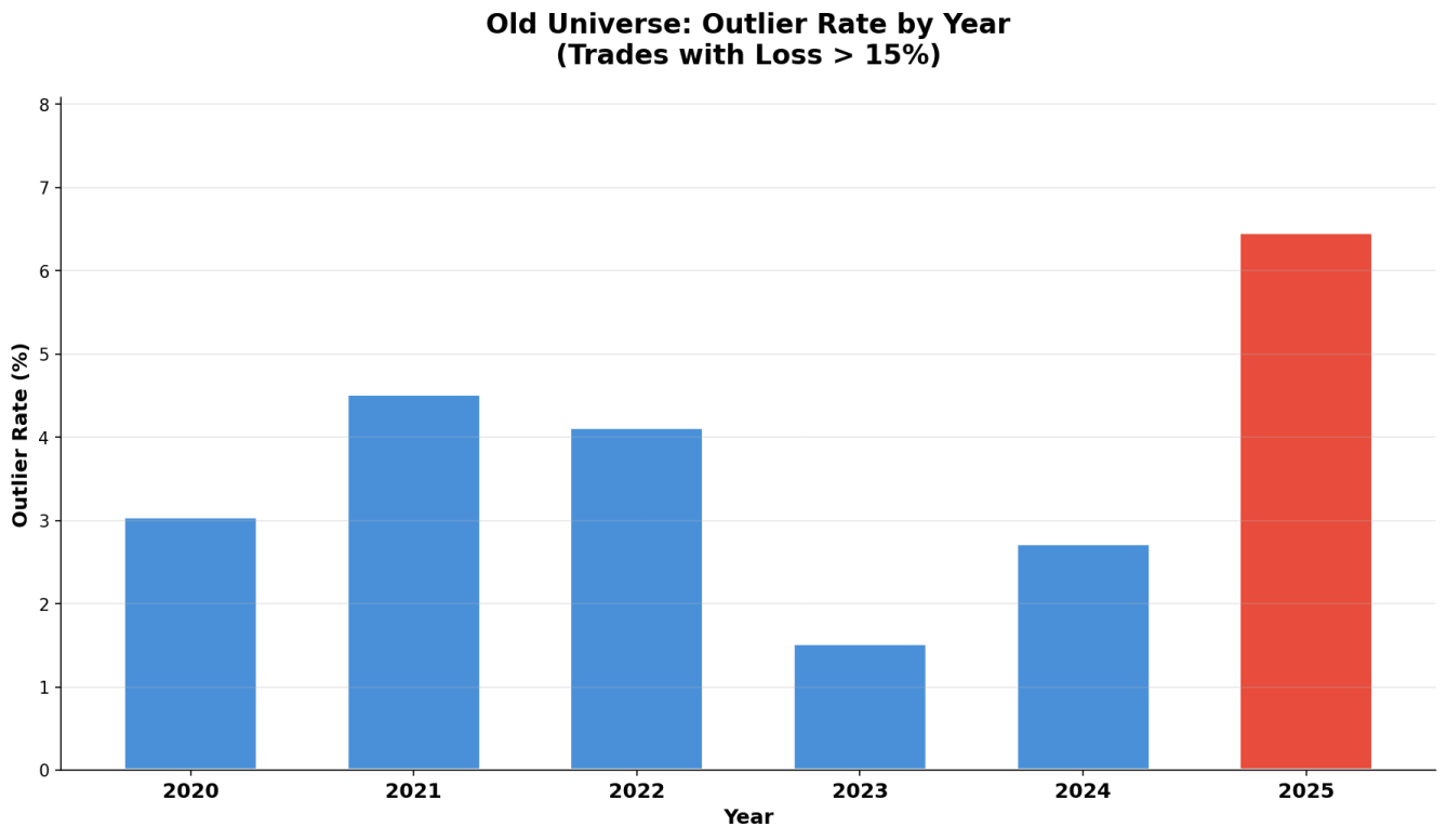 Percentage of trades with losses exceeding 25%, old vs new universe. 2020 - 2025